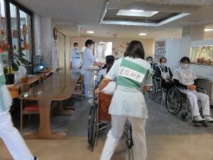 火災現場の夜勤者たちは大きな声で患者(役)を誘導し、見学で参加している職員にも緊迫した様子が伝わってきます。